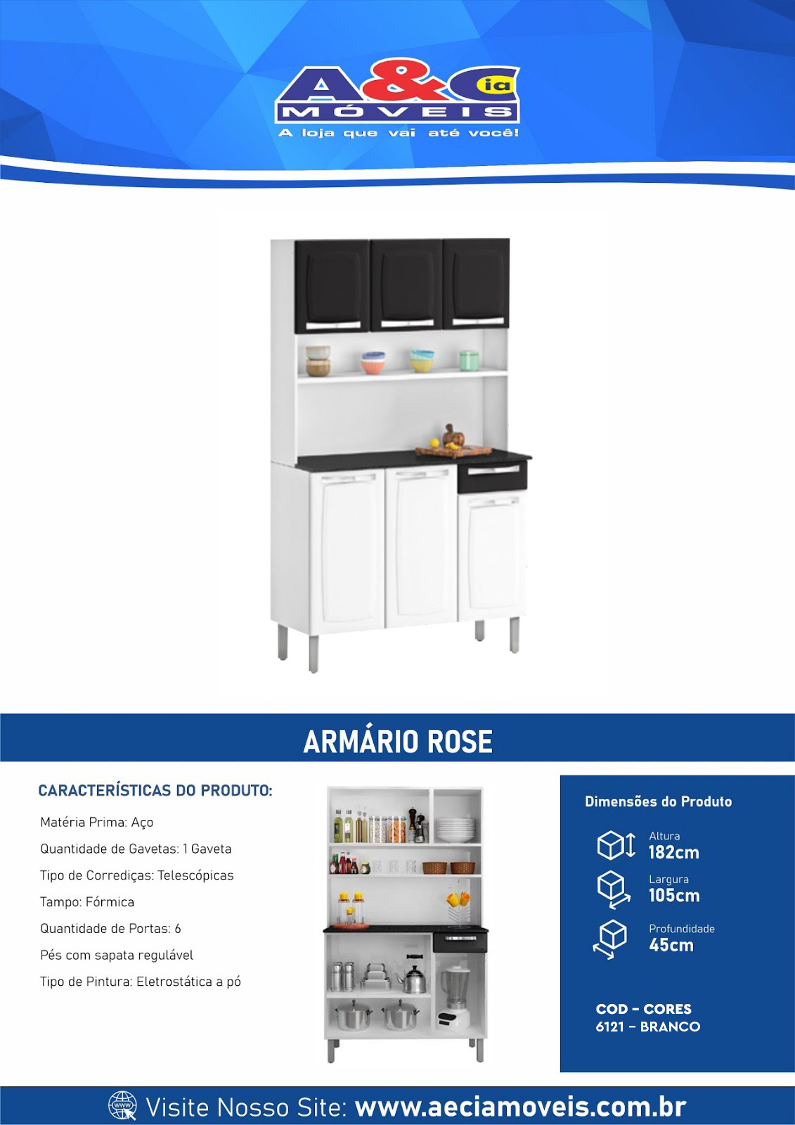 Composta por 6 portas, 1 gaveta e 4 prateleiras, com amplo espaço interno, perfeita para organizar a sua cozinha.