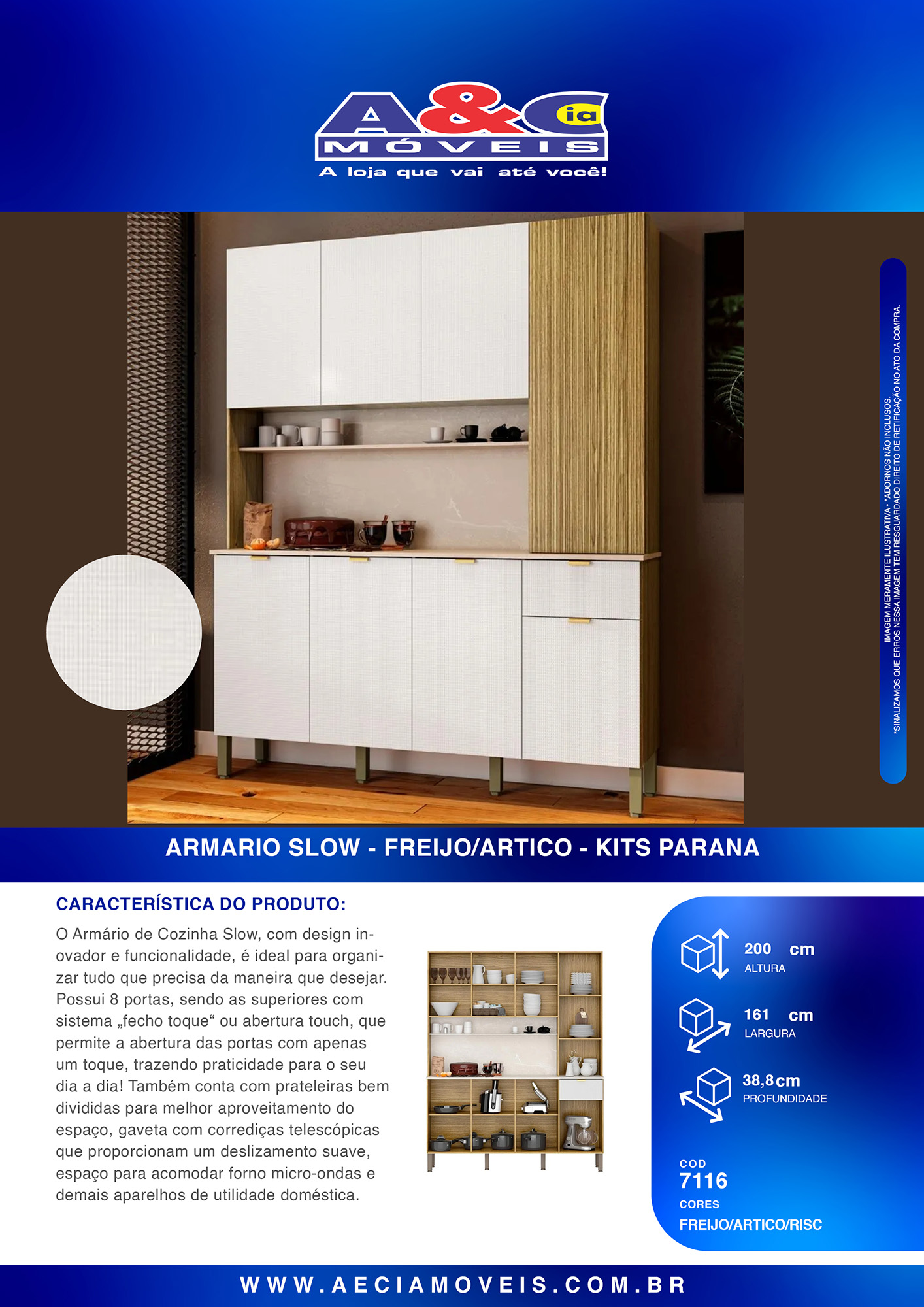 O Armário de Cozinha Slow, com design inovador e funcionalidade, é ideal para organizar tudo que precisa da maneira que desejar. Possui 8 portas, sendo as superiores com sistema fecho toque ou abertura touch, que permite a abertura das portas com apenas um toque, trazendo praticidade para o seu dia a dia! Também conta com prateleiras bem divididas para melhor aproveitamento do espaço, gaveta com corrediças telescópicas que proporcionam um deslizamento suave, espaço para acomodar forno micro-ondas e demais aparelhos de utilidade doméstica