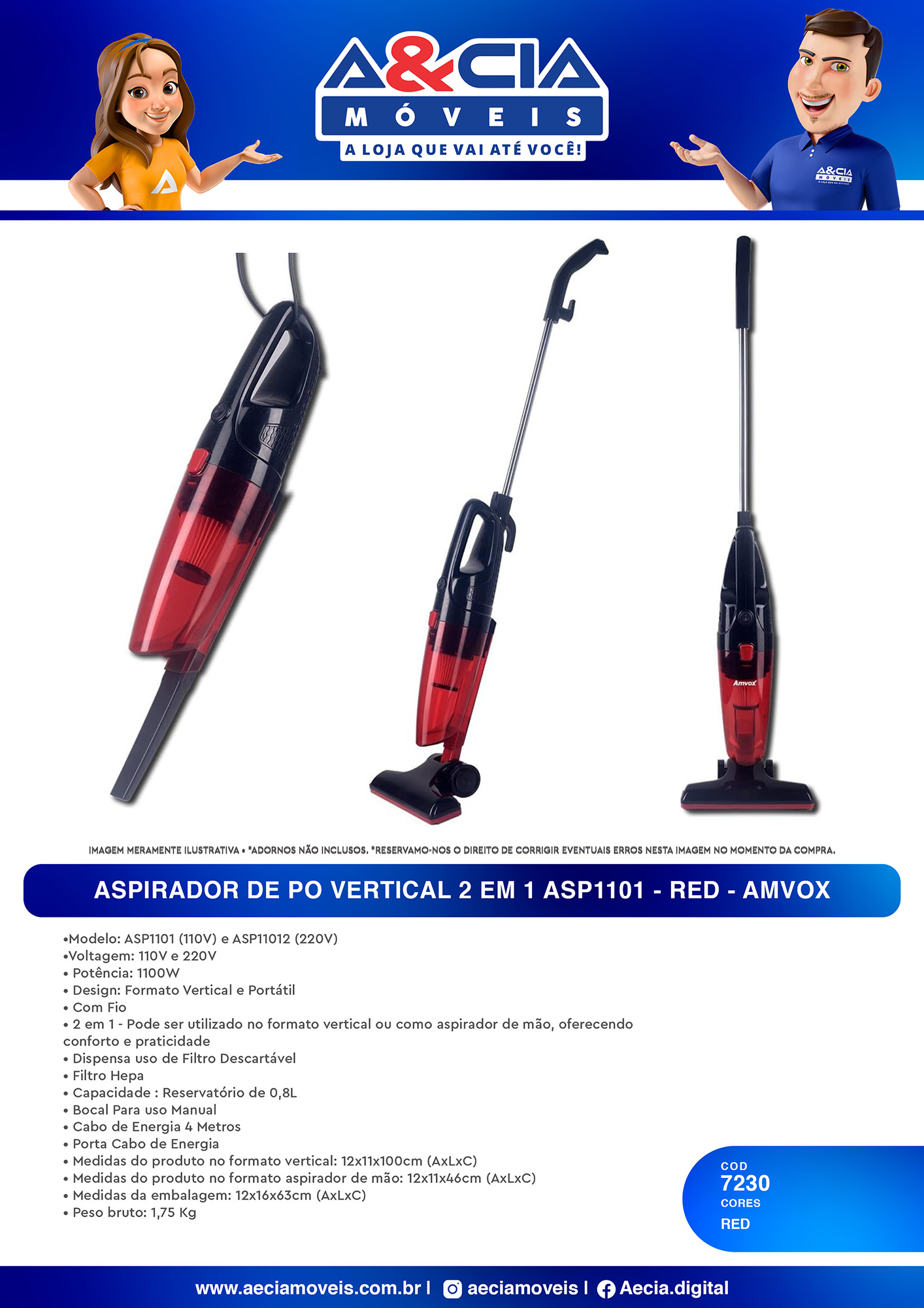 2 em 1 – Pode ser utilizado no formato vertical ou como aspirador de mão, oferecendo conforto e praticidade