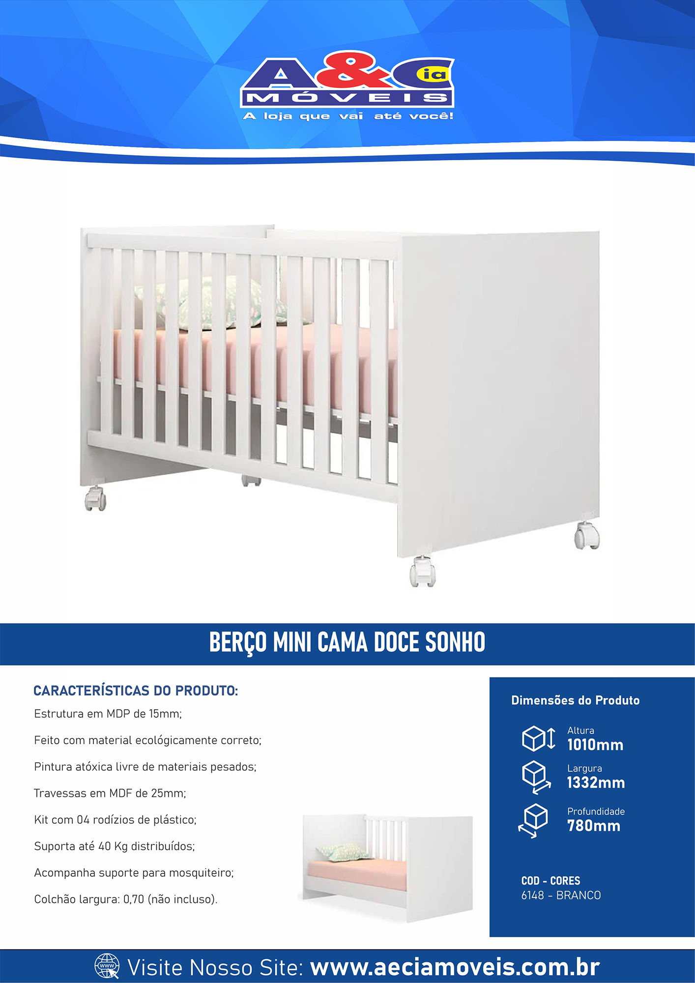 Colchão largura: 0,70 (Não incluso)