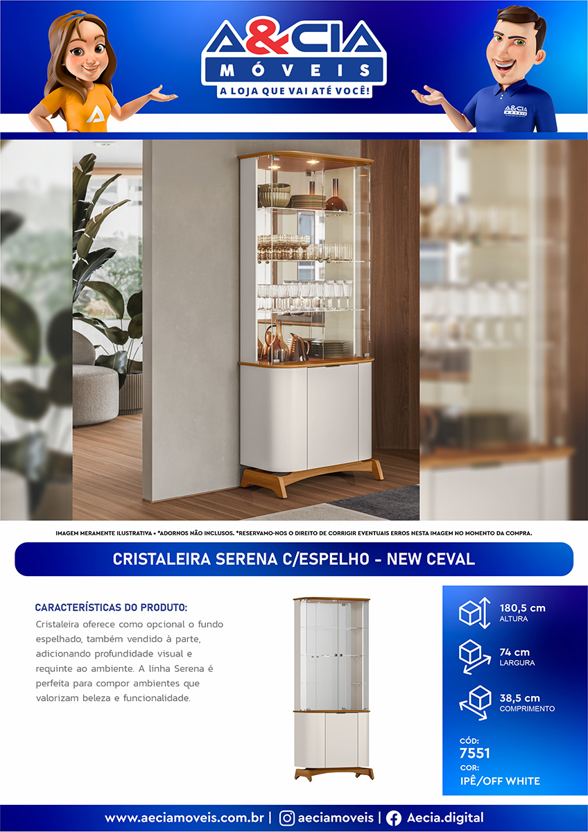 Cristaleira oferece como opcional o fundo espelhado, também vendido à parte, adicionando profundidade visual e requinte ao ambiente. A linha Serena é perfeita para compor ambientes que valorizam beleza e funcionalidade.