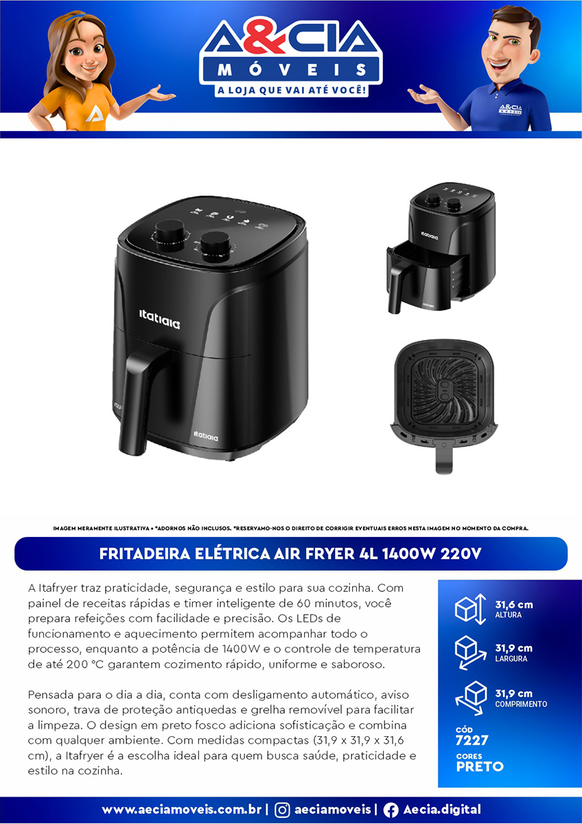 Transforme sua Cozinha com a Fritadeira Itafryer 4L 220V Itatiaia! Eleve sua experiência culinária com a Fritadeira Itafryer 4L 220V Itatiaia, a escolha definitiva para quem busca inovação, eficiência e um design elegante. Esta Air Fryer é a combinação perfeita para uma cozinha mais saudável e prática. Descubra todos os benefícios que fazem dela a opção ideal para suas refeições: