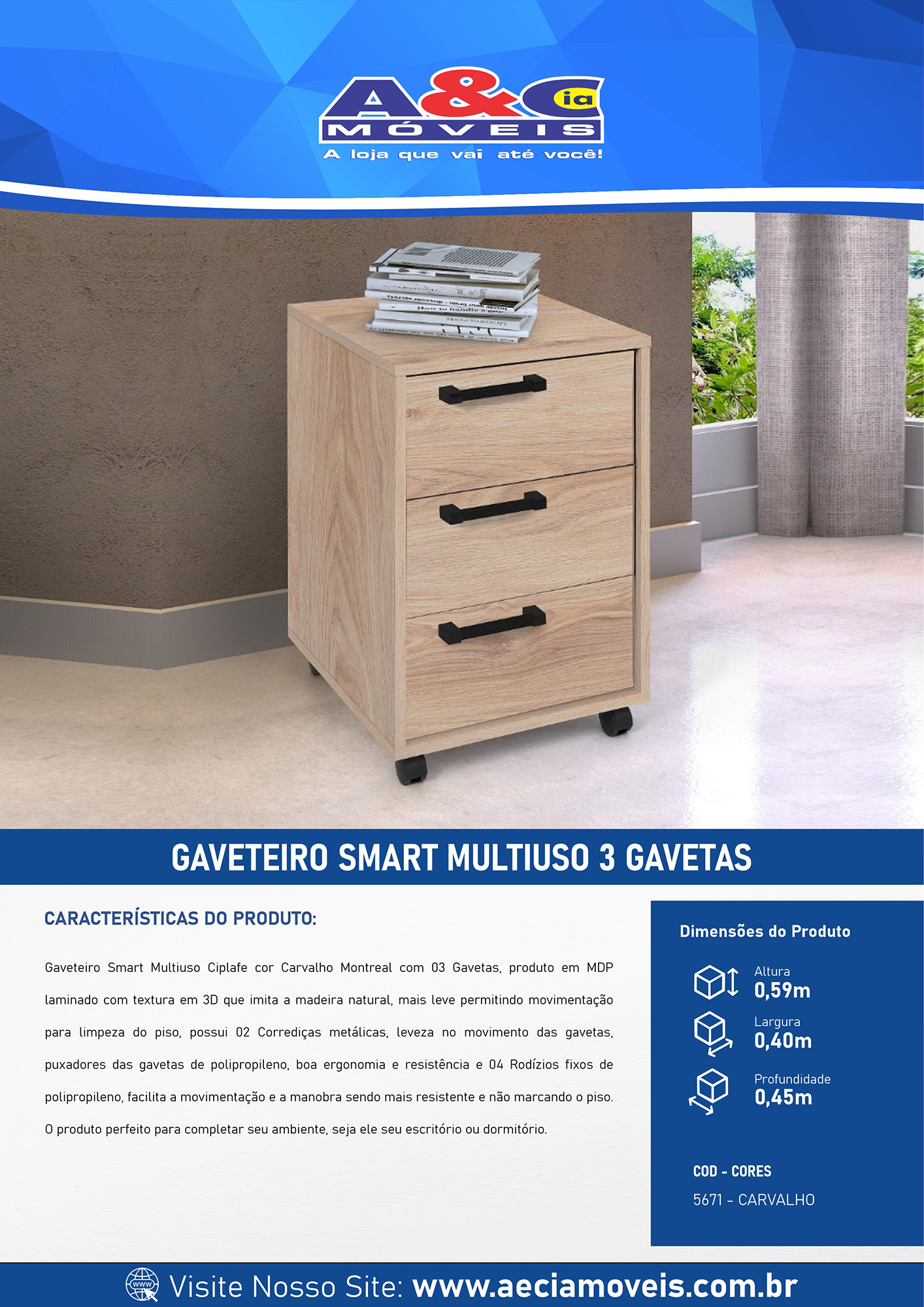 Gaveteiro Smart Multiuso Ciplafe cor Carvalho Montreal com 03 gavetas, produto em MDP laminado com textura em 3D que imita a madeira natural, mais leve permitindo movimentação para limpeza do piso, possui 02 corrediças metálicas, leveza no momento das gavetas, puxadores das gavetas de polipropileno, boa ergonomia e resistência e 04 rodízios fixos de polipropileno, facilita a movimentação e a manobra sendo mais resistente e não marcando o piso.