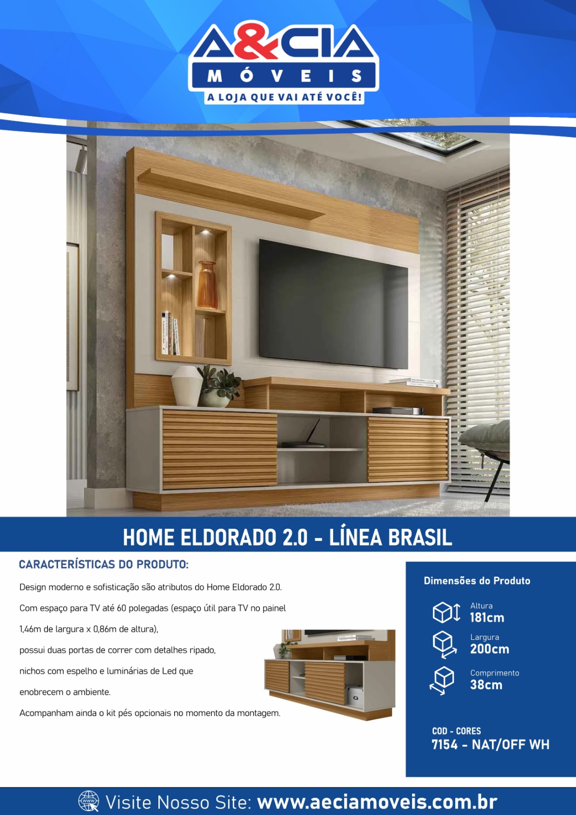 Com espaço para TV até 60 polegadas (espaço útil para TV no painel 1,46m de largura x 0,86m de altura), possui duas portas de correr com detalhes ripado, nichos com espelho e luminárias de Led que enobrecem o ambiente.