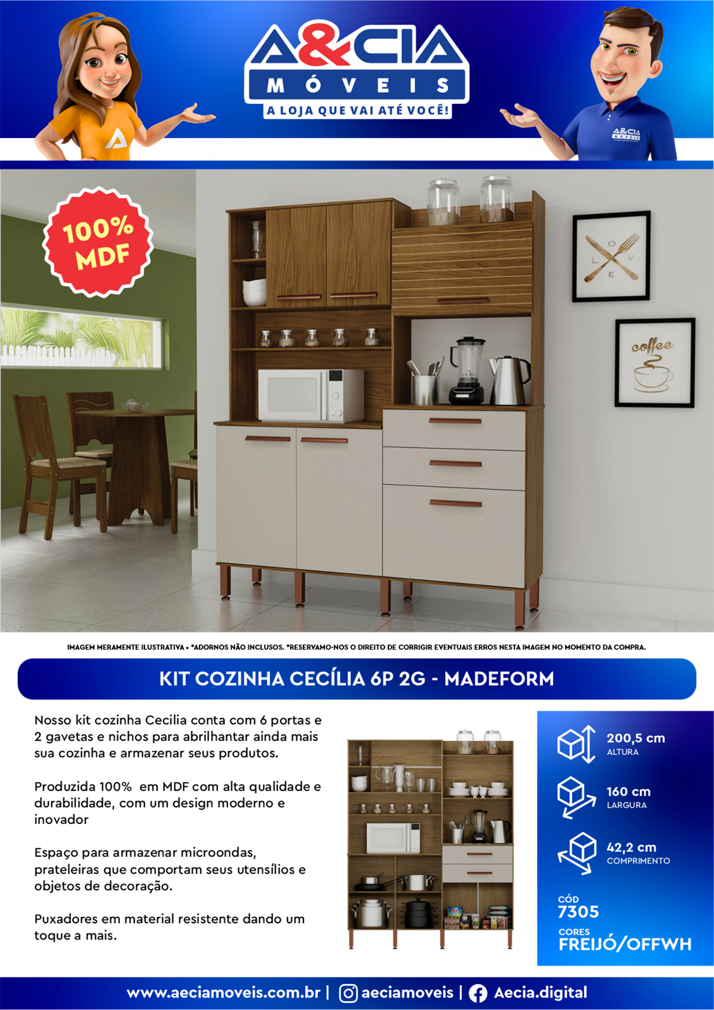 Nosso kit cozinha Cecilia conta com 6 portas e 2 gavetas e nichos para abrilhantar ainda mais sua cozinha e armazenar seus produtos.