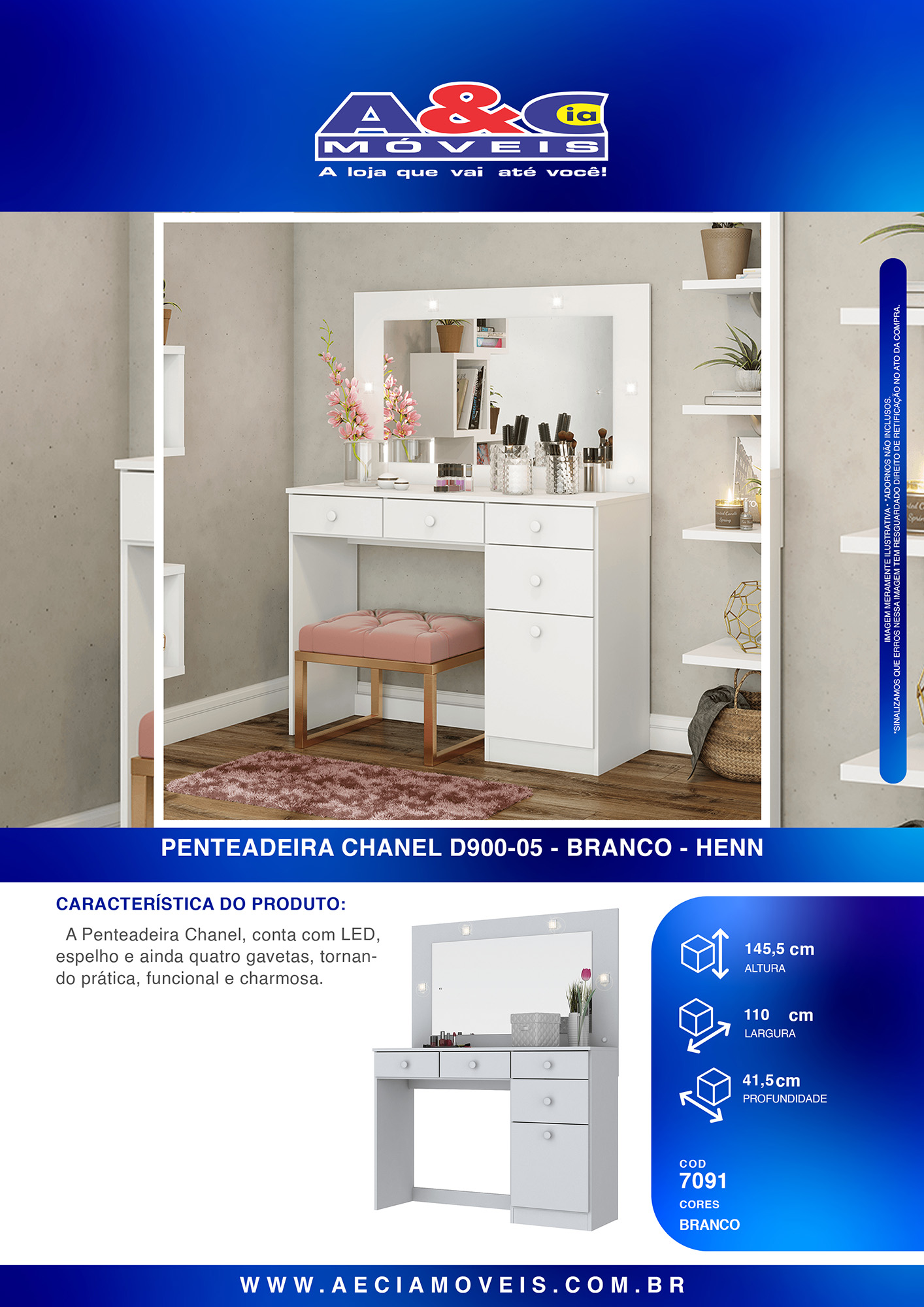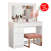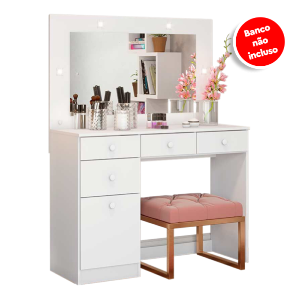A Penteadeira Chanel, conta com LED, espelho e ainda quatro gavetas, tornando prática, funcional e charmosa.