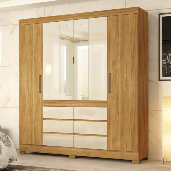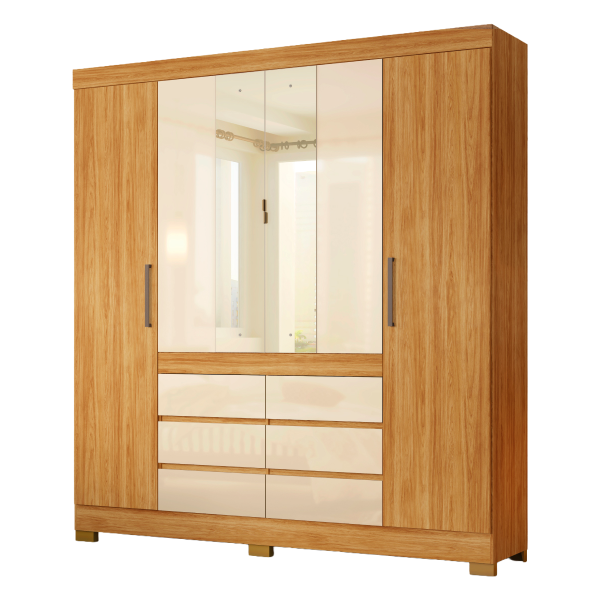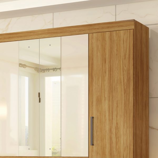 O Guarda-Roupa Casal Cádis tem estrutura em MDP e revestimento em pintura UV. Cabideiros e calceiros metálicos. Gavetas externas com corrediças metálicas. Portas de giro com dobradiças metálicas. Portas de giro centrais com espelhos e puxadores metálicos. Puxadores em plástico ABS.