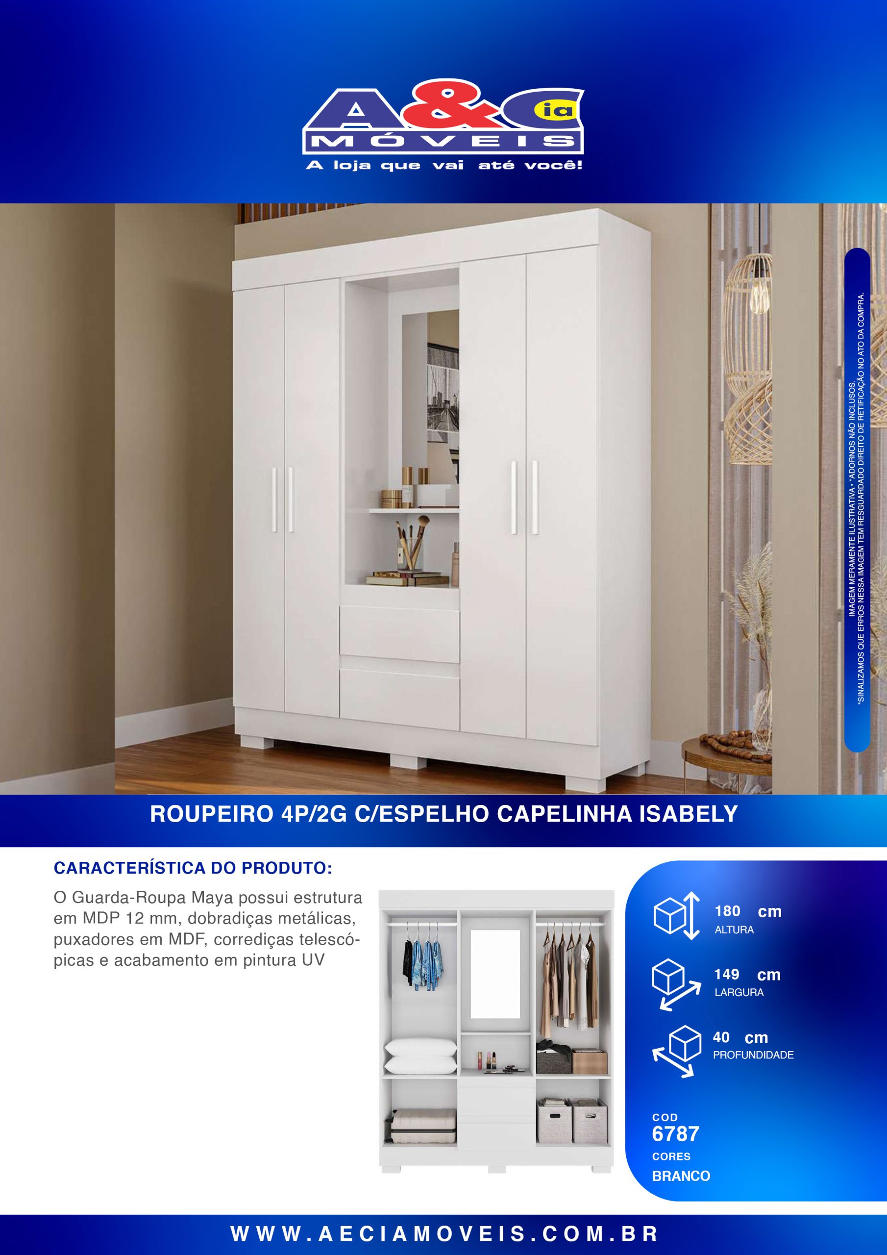 O Guarda-Roupa Maya possui estrutura em MDP 12 mm, dobradiças metálicas, puxadores em MDF, corrediças telescópicas e acabamento em pintura UV