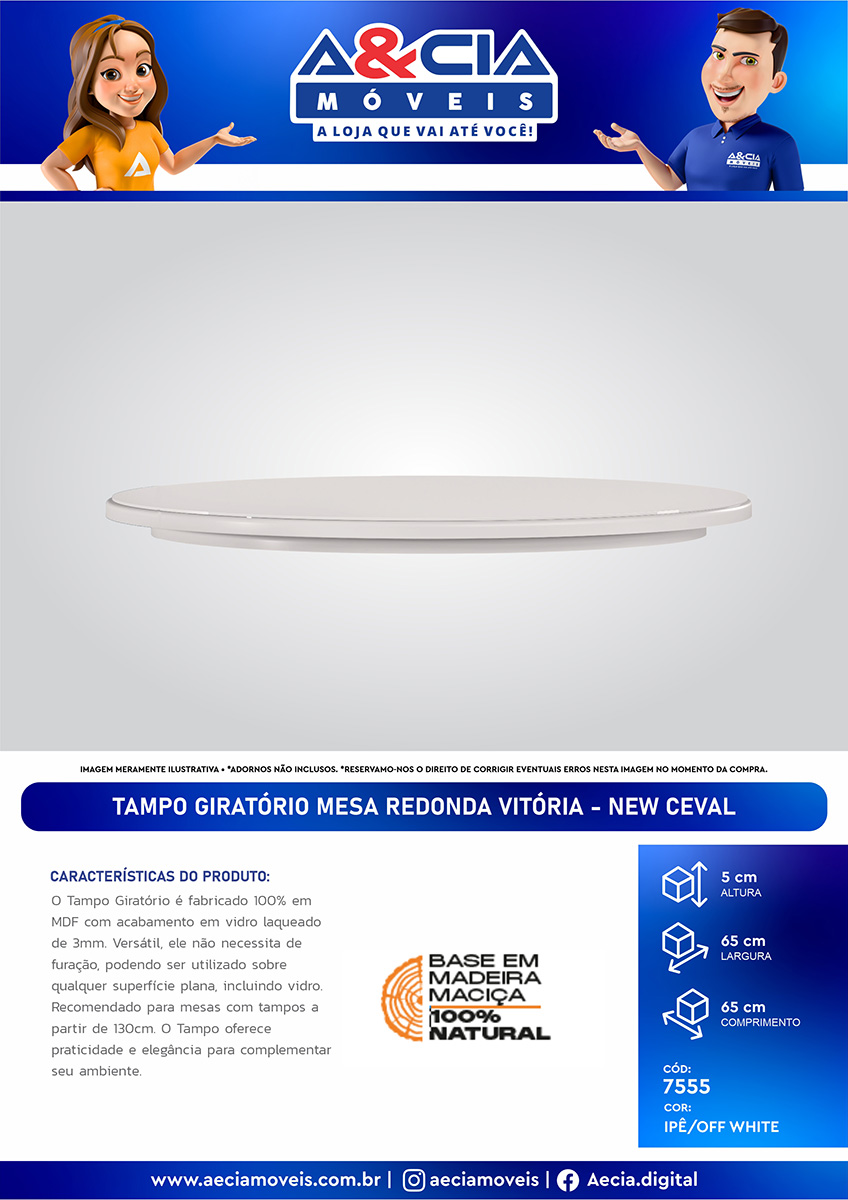 O Tampo Giratório é fabricado 100% em MDF com acabamento em vidro laqueado de 3mm. Versátil, ele não necessita de furação, podendo ser utilizado sobre qualquer superfície plana, incluindo vidro. Recomendado para mesas com tampos a partir de 130cm. O Tampo oferece praticidade e elegância para complementar seu ambiente.